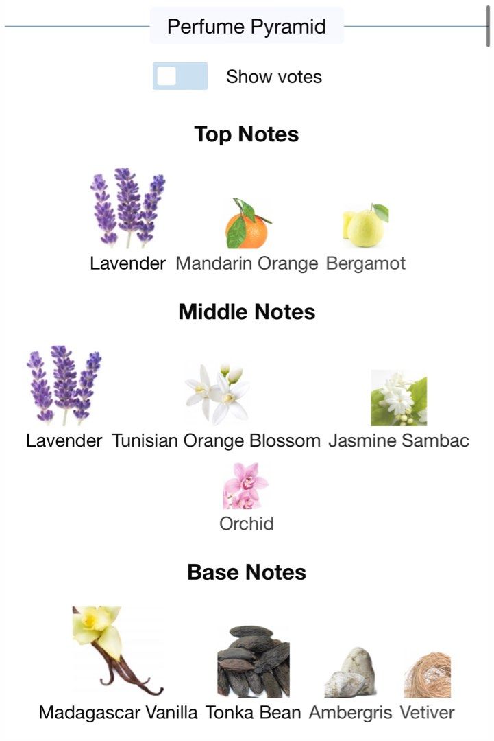 middle notes are Lavender, Tunisian Orange Blossom, Jasmine Sambac and Orchid;